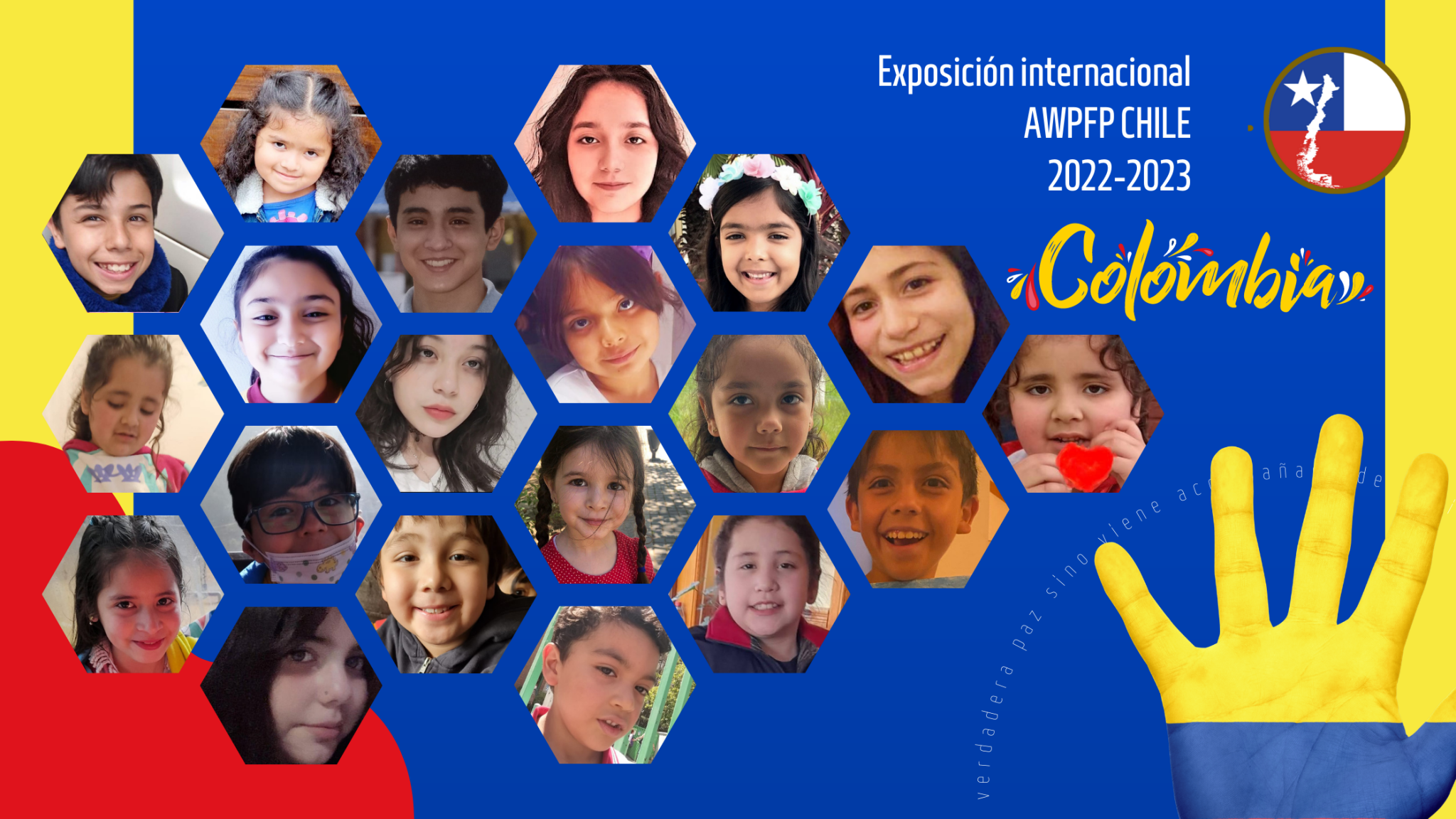 Este año COLOMBIA es la sede de esta noble causa (sus Representantes Juan Guillermo Ocampo Salgado de HUILA , Lily Muñoz M , Diego Diego Ruano Arboleda , George GuevaraCh de NARIÑO , Ata Hisca de BOYACÁ y ANTIOQUIA , Geison Marin de CUNDINAMARCA , Andrés Garcés de QUINDIO , Alexander Altamiranda por el Departamento de CÓRDOBA y a su Coordinador John Richard Gómez Márquez), con la participación de más de 140 países y 250 coordinadores alrededor del mundo. En la coordinación del equipo de Chile contamos con Gladys Ibáñez, Fabio Vásquez, Fabaries Vásquez y el Presidente de AWPFP Miguel Piñero de Venezuela, quienes les dan la más grata bienvenida a todos los coordinadores, participantes, niños y público en general de todos los rincones del mundo, que formarán parte de esta noble iniciativa.